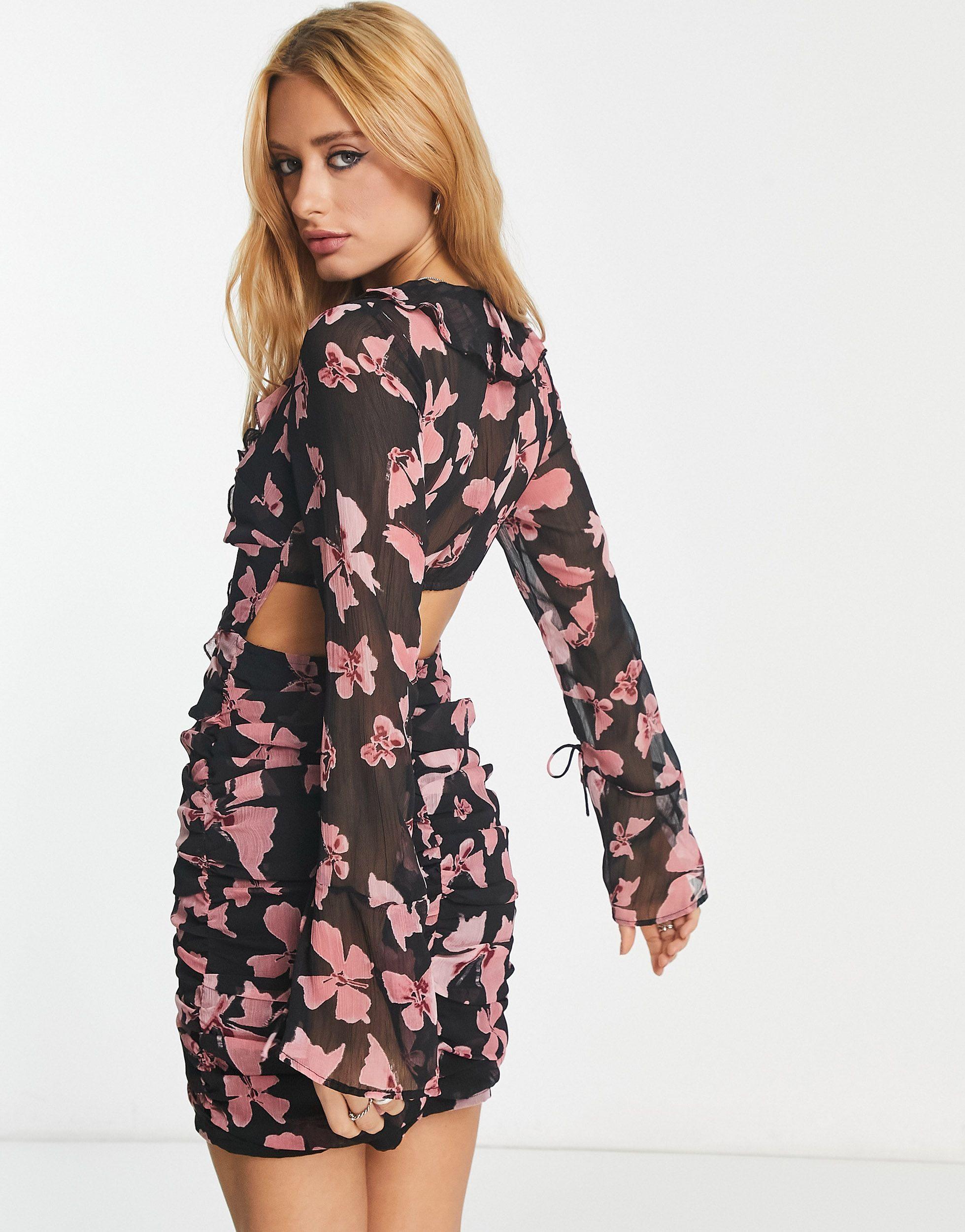Asos Ruched Mini Dress With Fluted Sleeves Lyst Uk